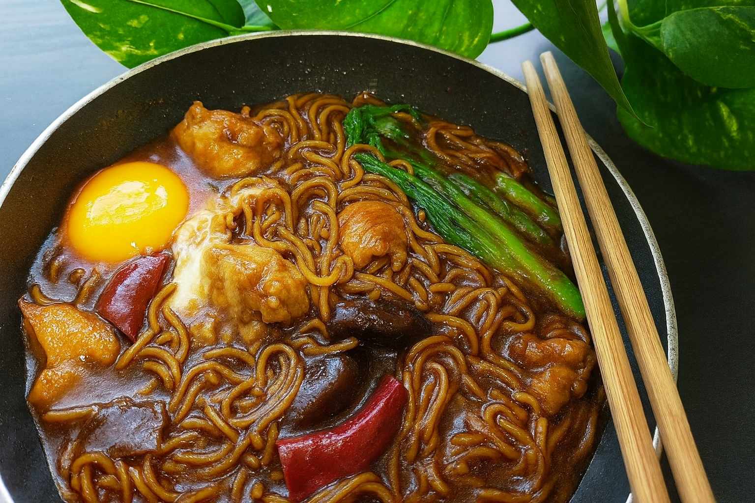 7. Curah kuah panas – Terus tuang kuah pekat bersama ayam/daging dan fish cake ke atas mee.